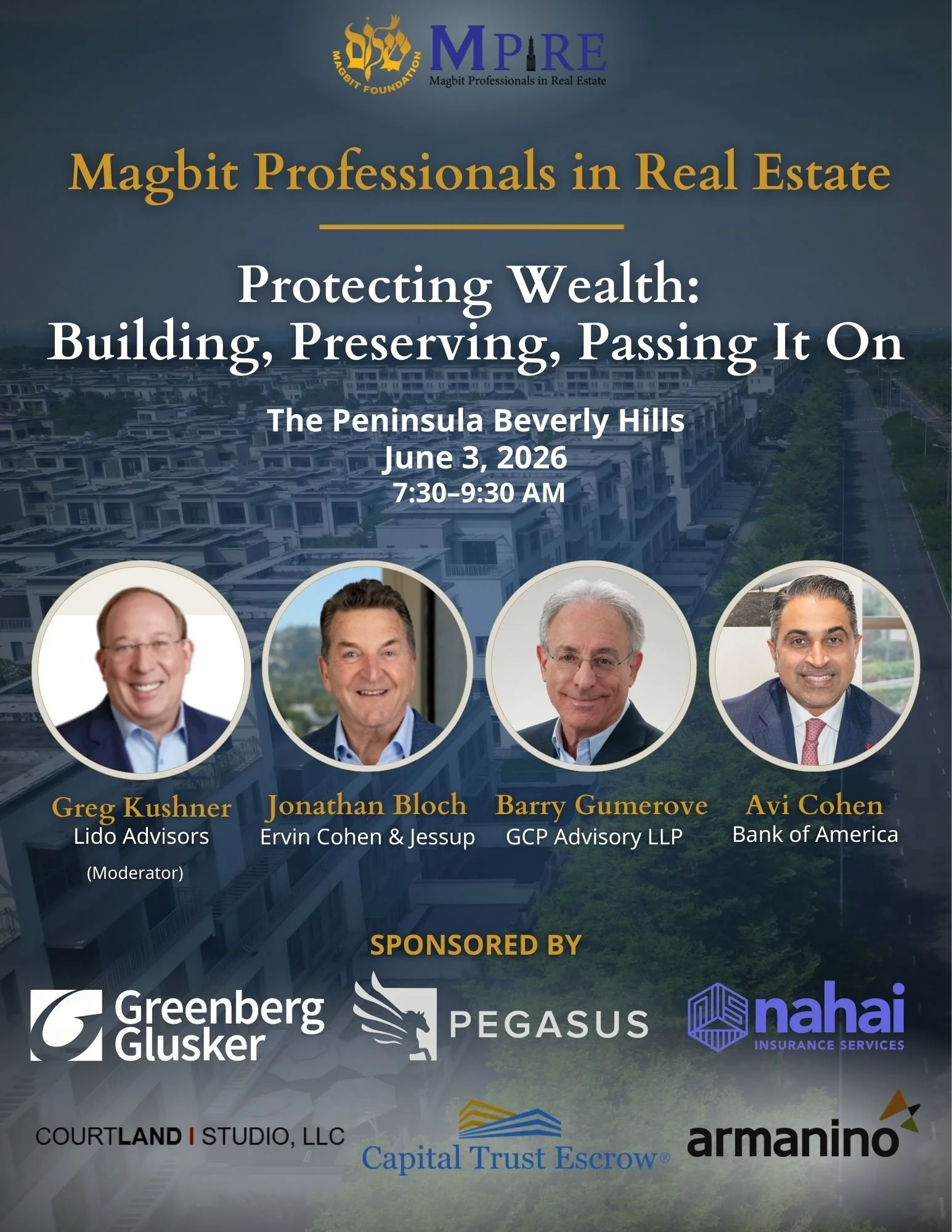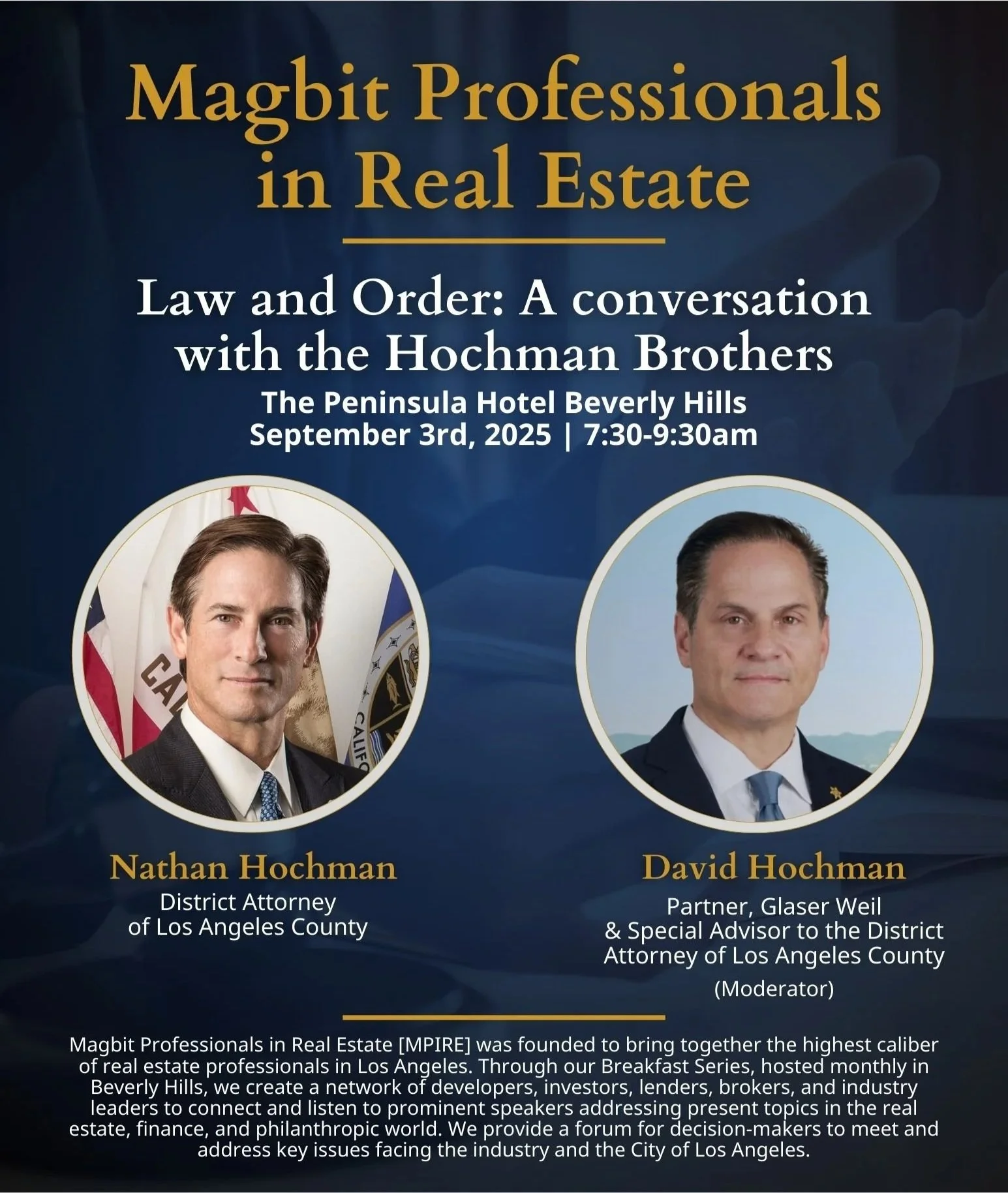 Magbit Professionals in Real Estate [MPIRE] was founded to bring together the highest caliber of real estate professionals in Los Angeles. Through our Breakfast Series, hosted monthly in Beverly Hills, we create a network of developers, investors, lenders, brokers, and industry leaders to connect and listen to prominent speakers addressing present topics in the real estate, finance, and philanthropic world. We provide a forum for decision-makers to meet and address key issues facing the industry and the City of Los Angeles.